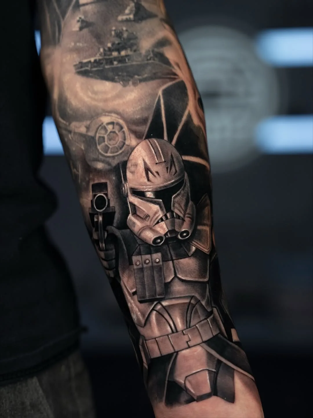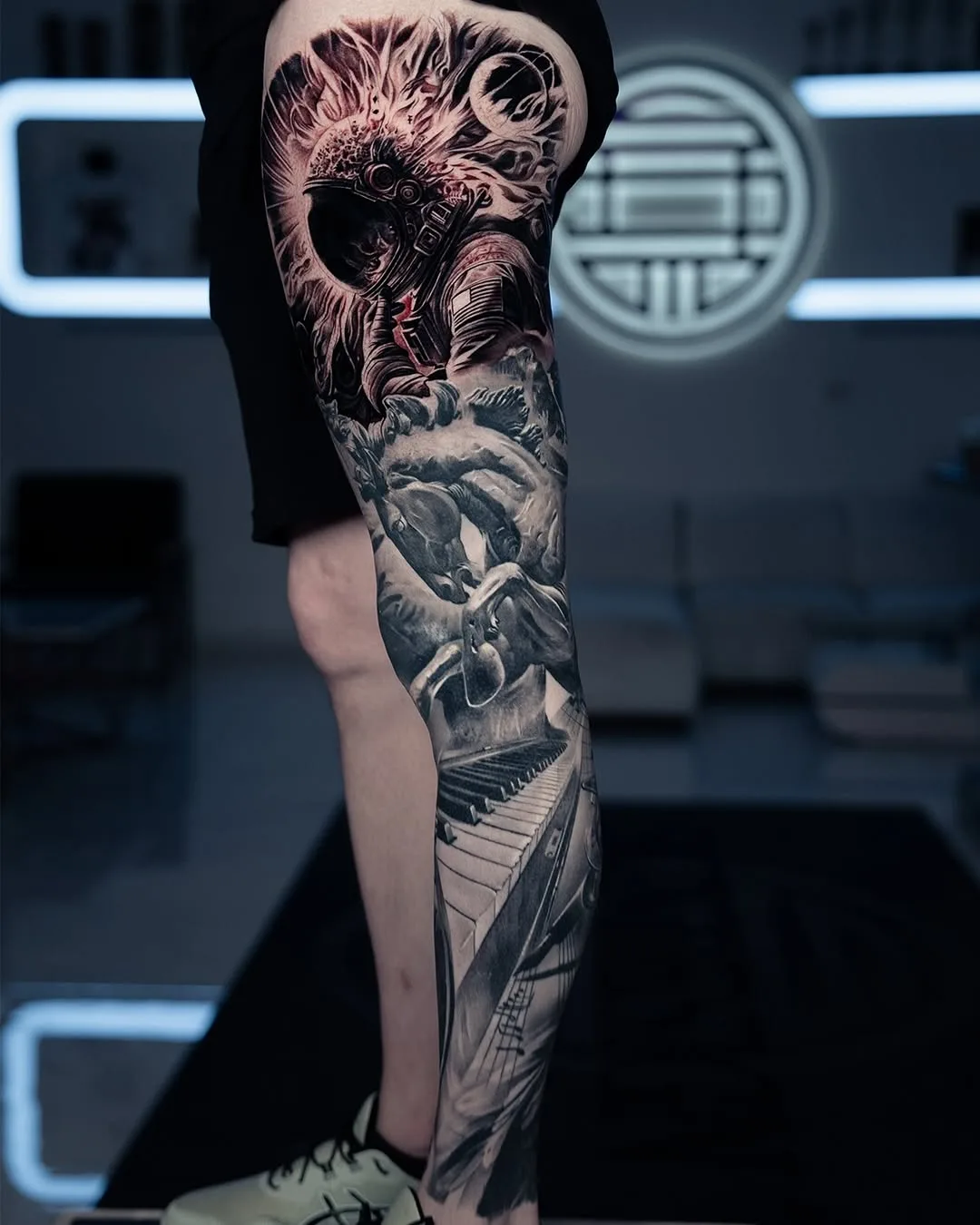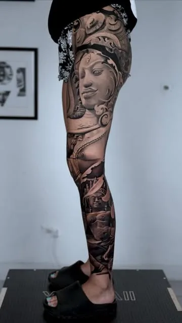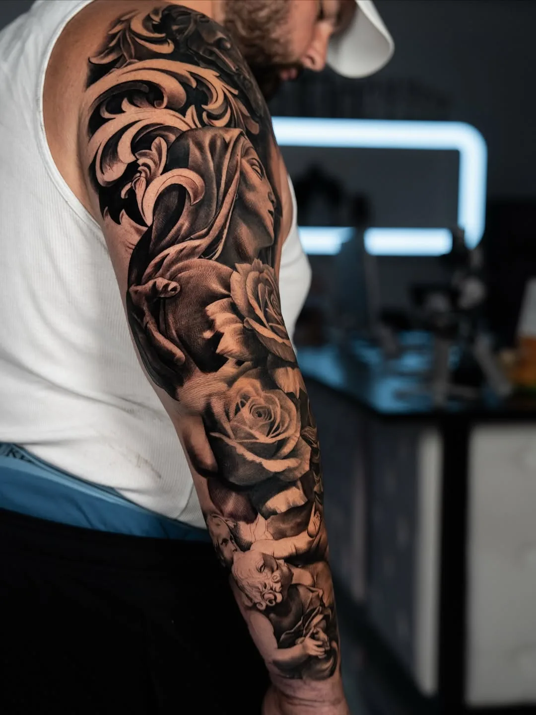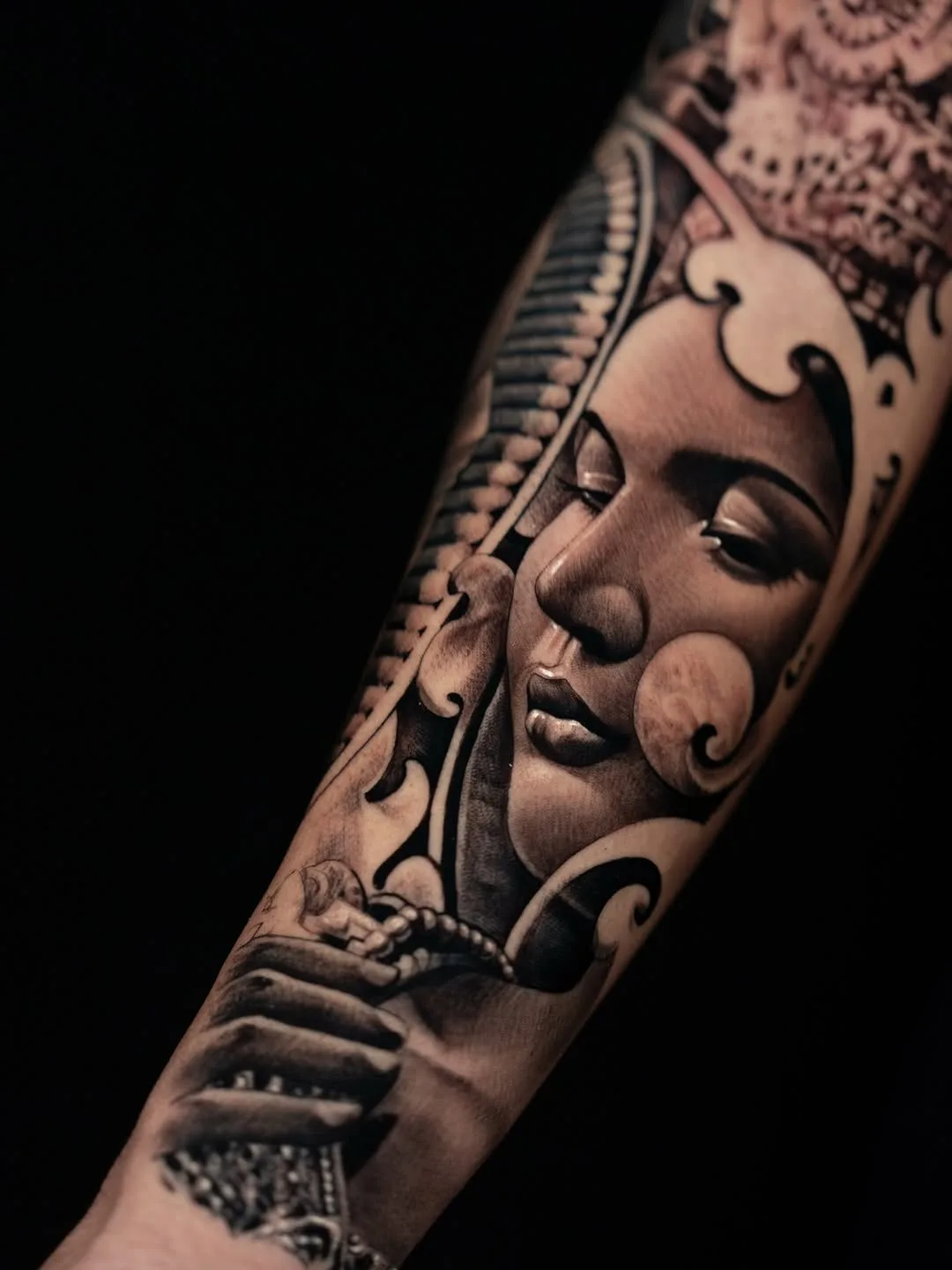 Black & grey realism, fine-line work, portraits, and large-scale compositions.